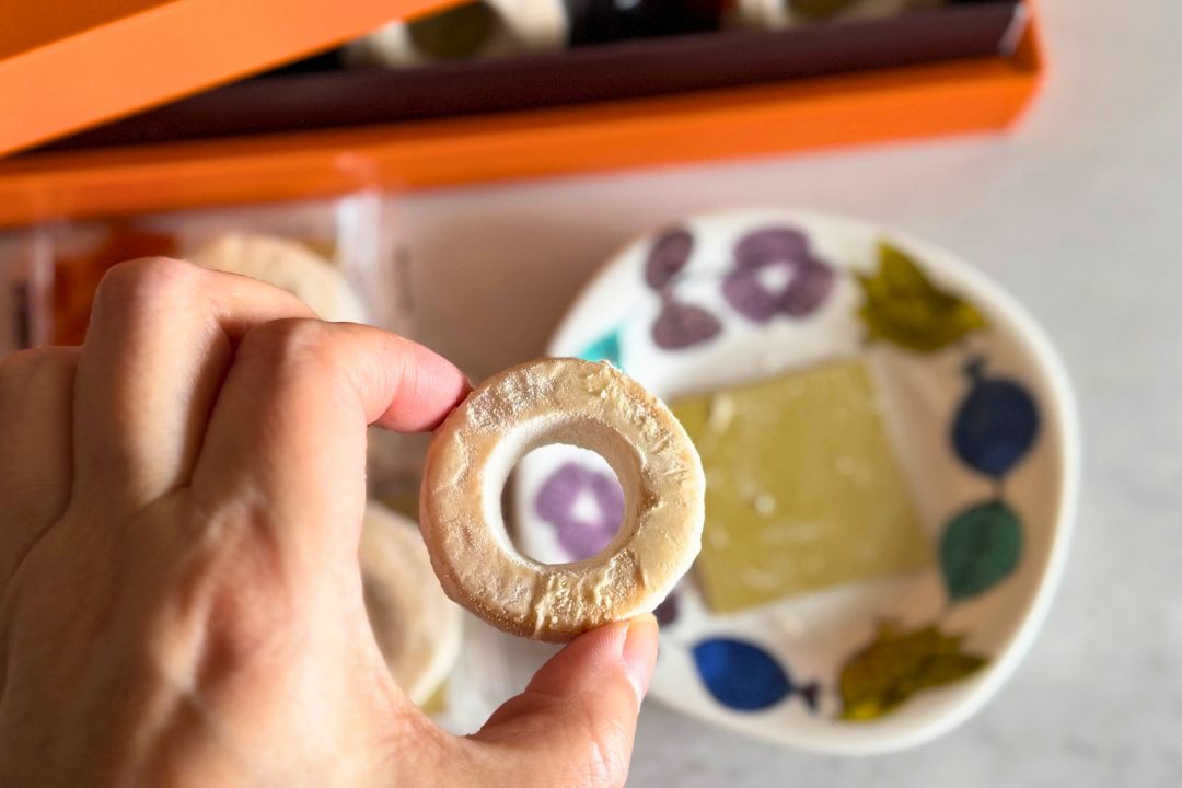 最初にいただいたとき、箱を開けた瞬間のきれいなドーナツ型がかわいくて。手に取ると和三盆糖がしっかりまとっていて、口に入れた途端ほろっとほどける感じでした。あとからバターの香りがふわっと残って、砕いたマカダミアナッツの香ばしさがアクセントになっていました。